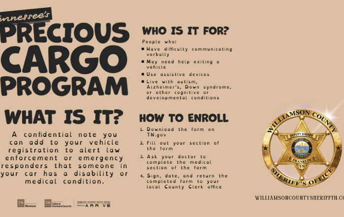 The Precious Cargo Program allows drivers with disabilities or medical conditions to add a confidential note to their vehicle registration to alert law enforcement or medical personnel in the event of a traffic stop or an emergency.